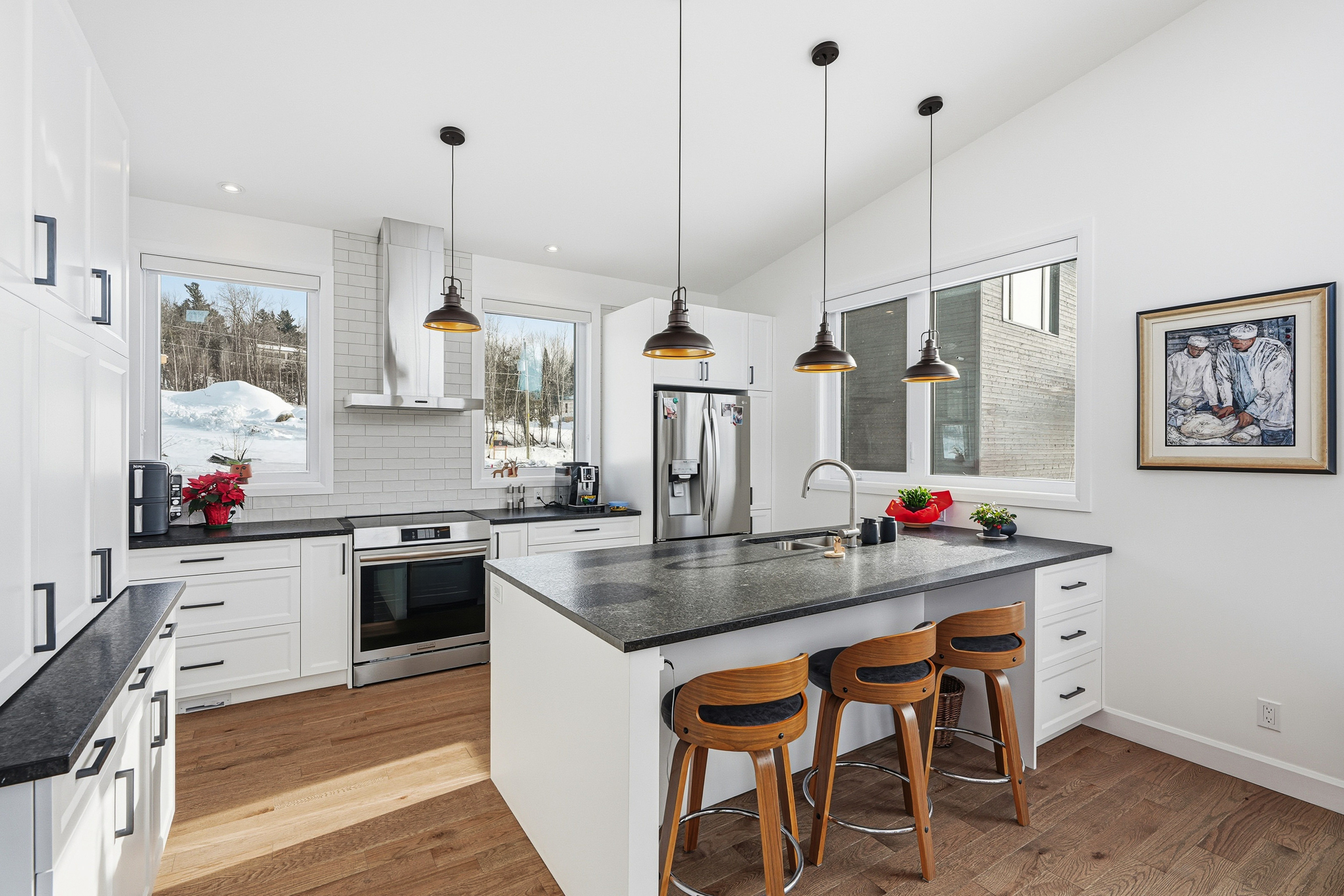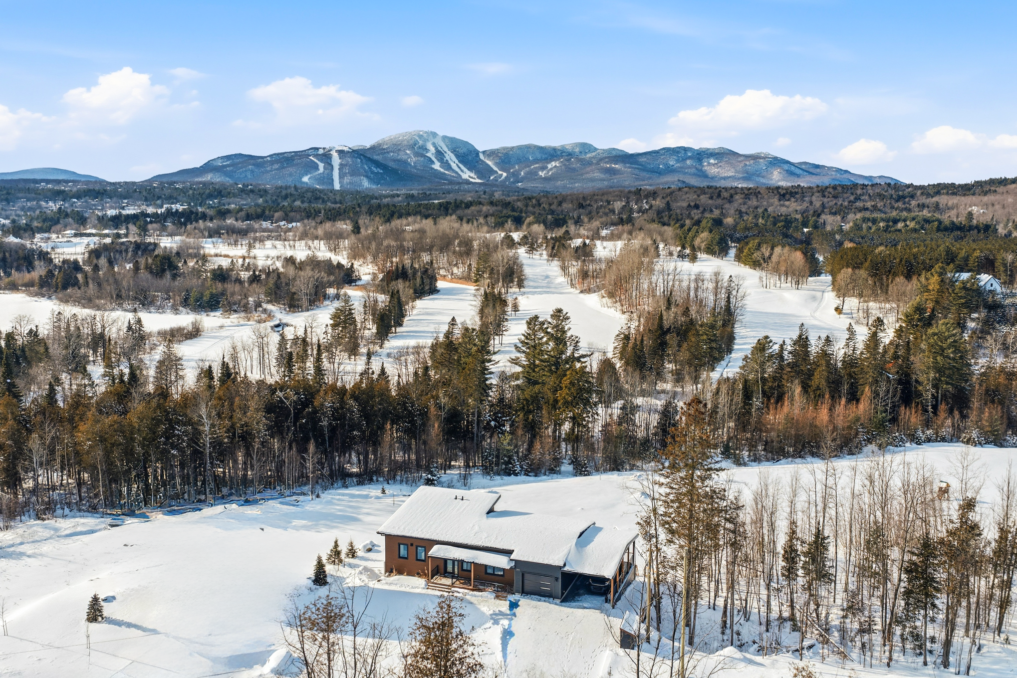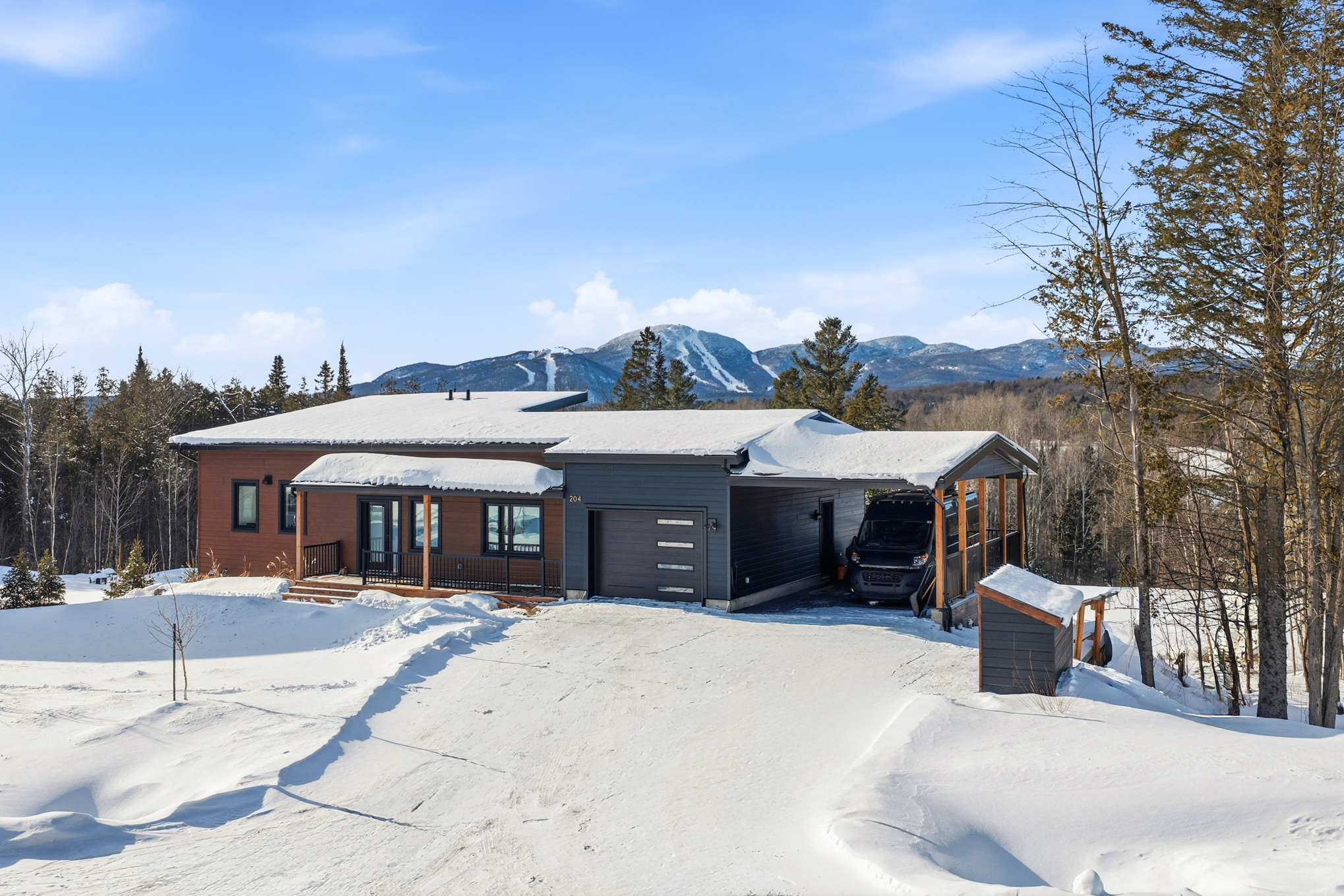 Spread over a garden level and a ground floor with terrace, this eco-friendly home offers a large, bright living room, where generous windows let in sunlight throughout the day. The spaces are fluid, functional, and naturally invite you to slow down. There are two bedrooms, two bathrooms, a garage, a carport, and a multipurpose room on the garden level. It's an ideal place to play, read, or simply relax while admiring Mount Orford.