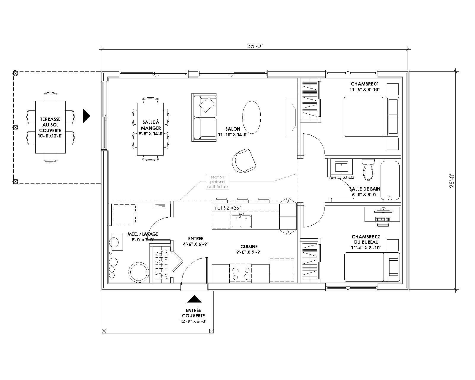 More than just a house, this 875-square-foot single-storey ADA-2+ model is a true haven where you can enjoy every moment to the full. Offering two bedrooms, one bathroom and luminous living spaces, thanks to large windows and a cathedral ceiling, its sleek, contemporary design will seduce you with its practicality and harmony with nature.