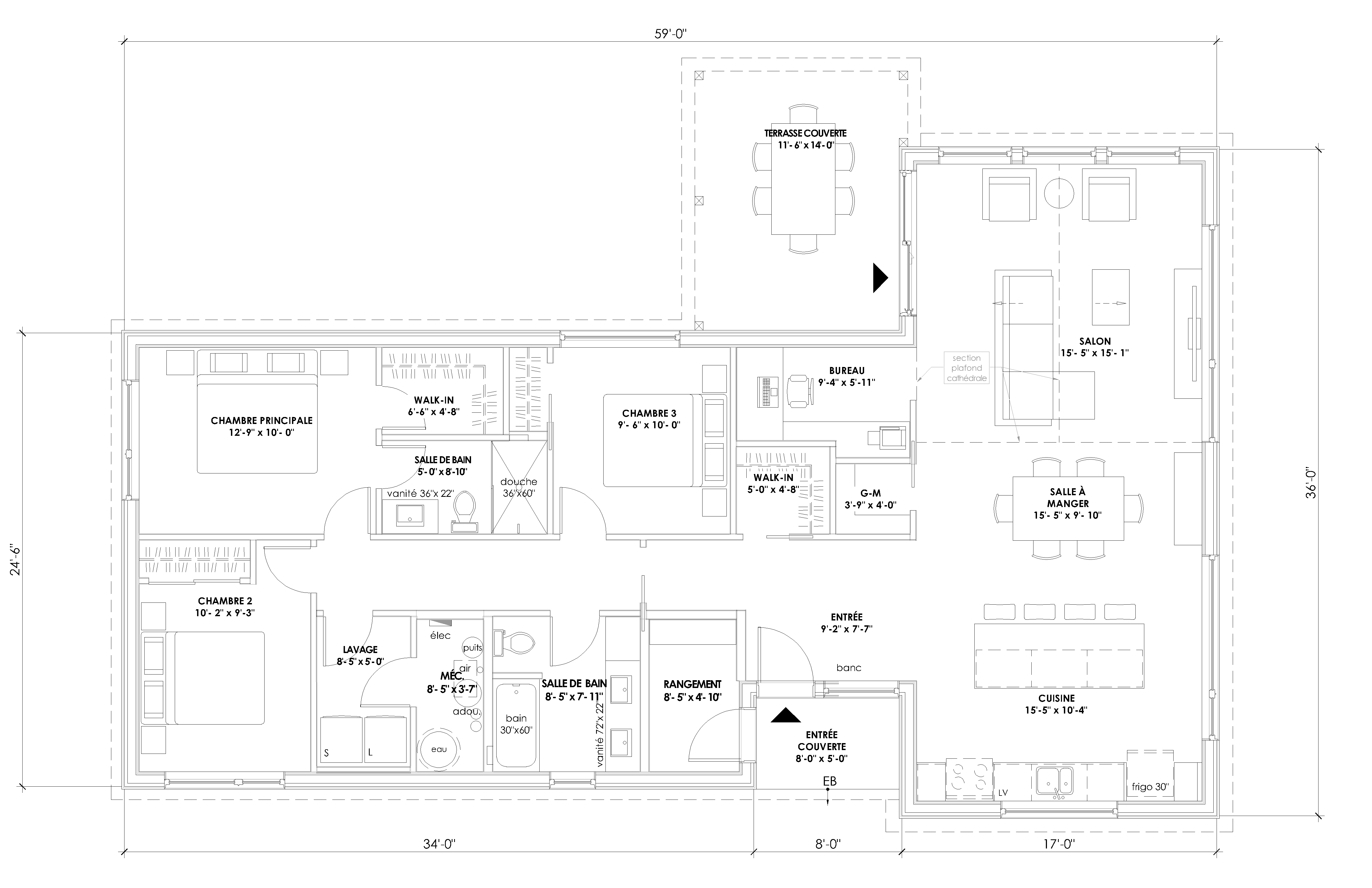 Profitez d’un cadre de vie lumineux et spacieux avec ce modèle LÖNN-3+ de 1602 pieds carrés, tout sur un seul étage. Il comprend trois chambres, deux salles de bain et un plafond cathédrale qui ajoute une dimension supplémentaire à l’espace de vie. Grâce à sa terrasse couverte, vous pourrez savourer les saisons tout en étant en parfaite harmonie avec la nature. Ce modèle vous offre tout le confort nécessaire pour vivre en toute sérénité, dans un environnement où simplicité et bien-être se conjuguent parfaitement.